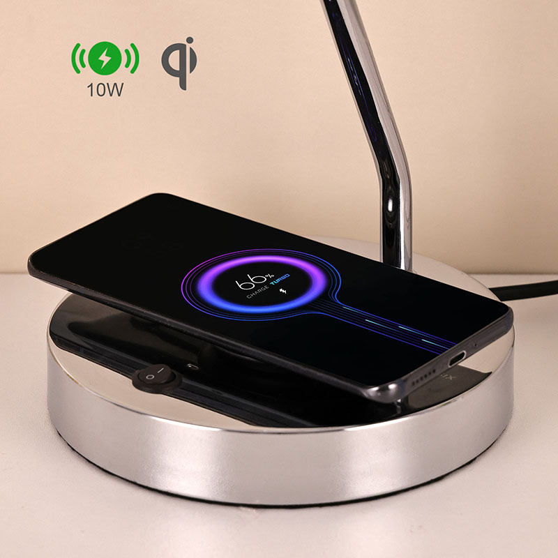 ওয়্যারলেস চার্জার সহ ডেস্ক ল্যাম্পের বেস অন/অফের উপর একটি কন্ট্রোল বোতাম থাকে
