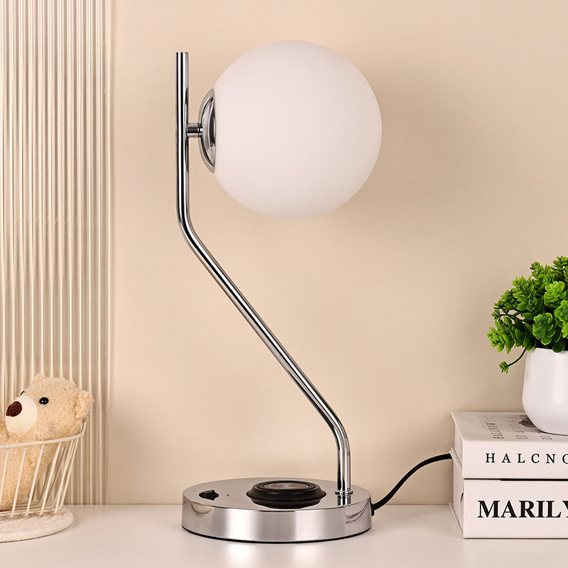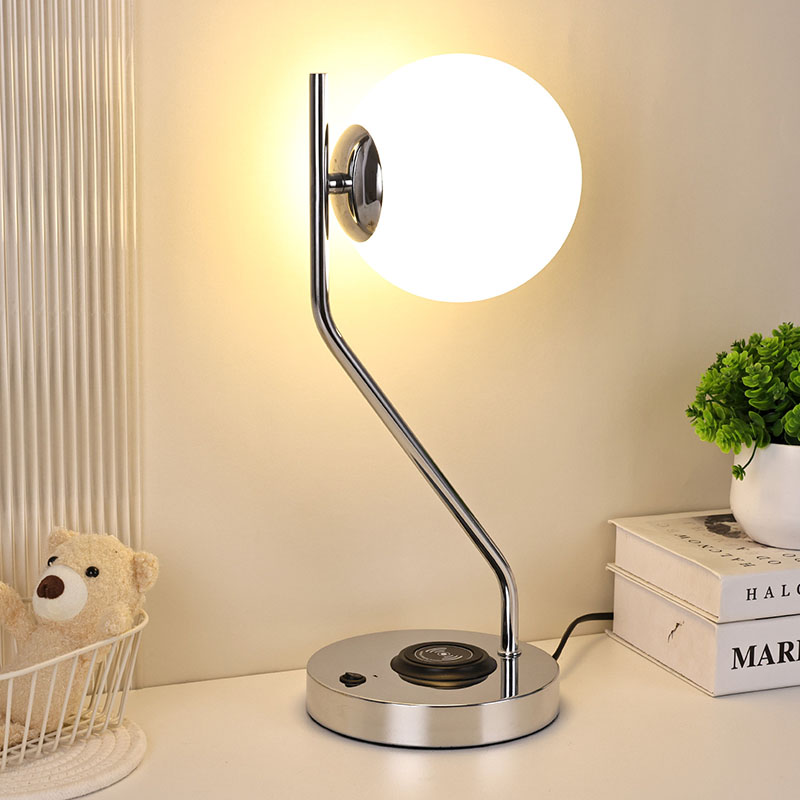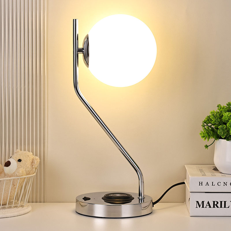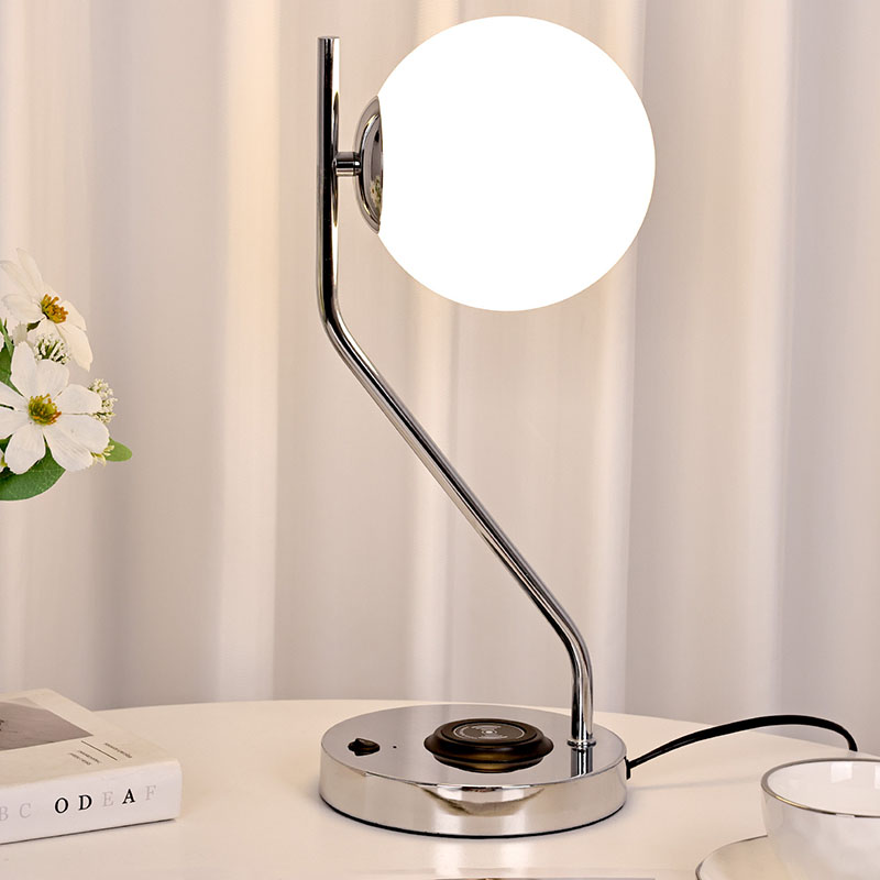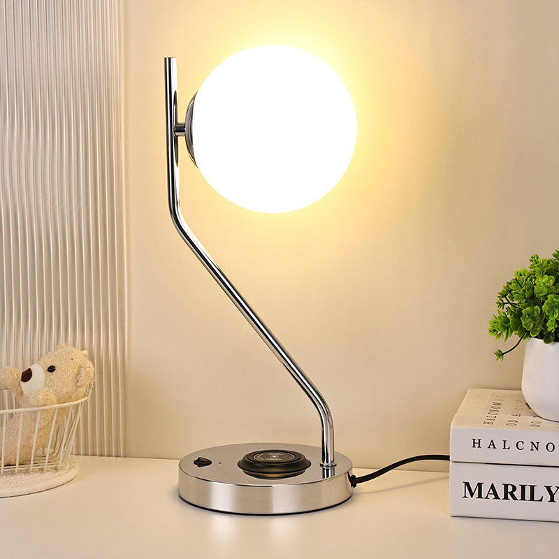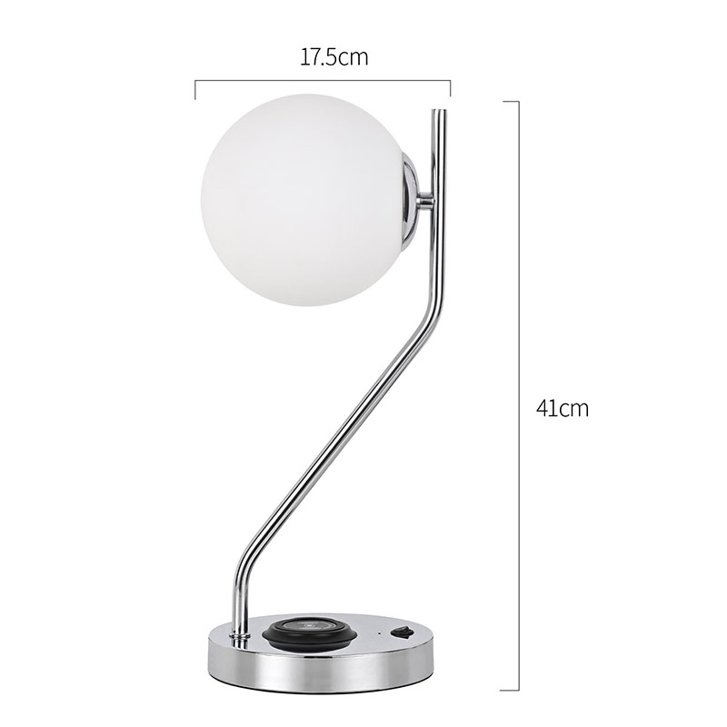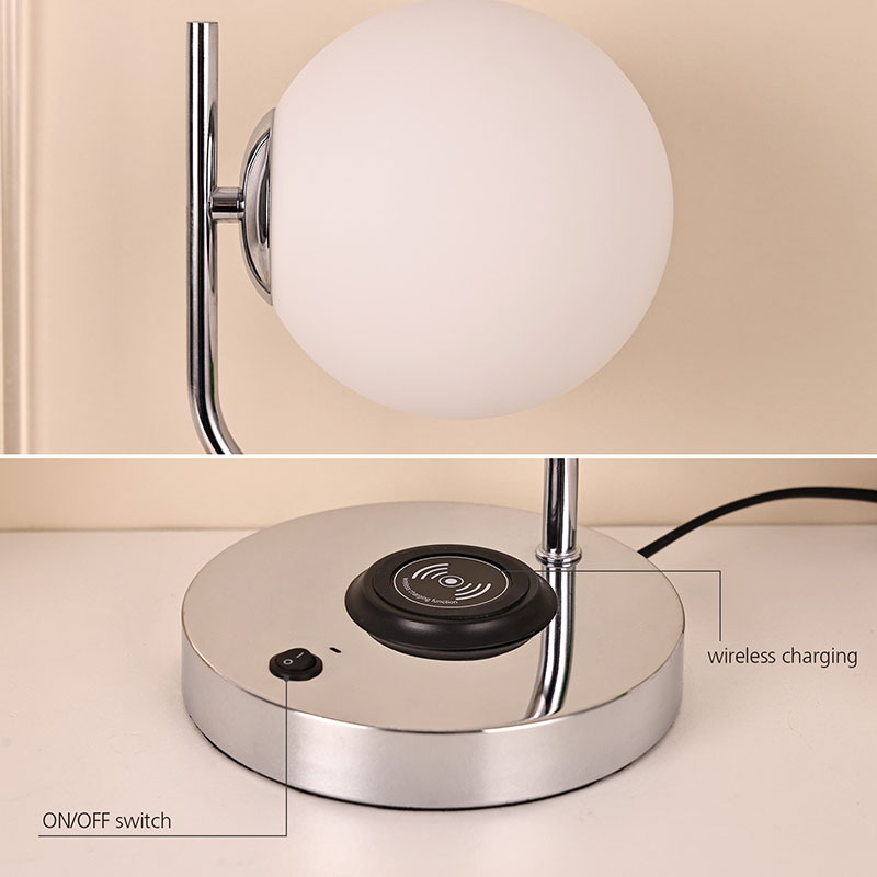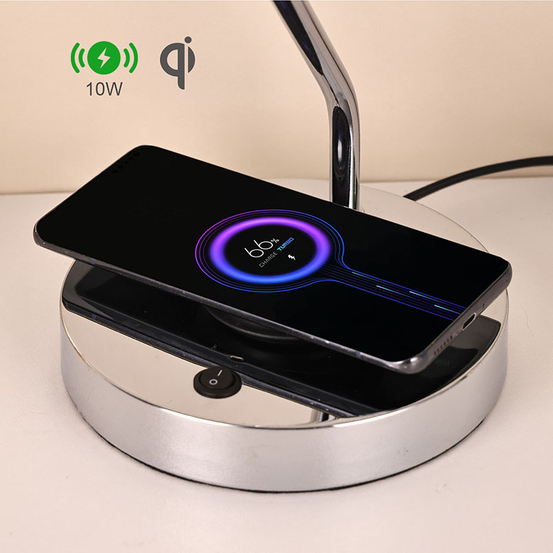 ওয়্যারলেস চার্জার সহ গ্লাস শেড ডেস্ক ল্যাম্প এছাড়াও একটি ধাতব ওয়্যারলেস মোবাইল ফোন চার্জিং বেস দিয়ে সজ্জিত। ক্লান্তিকর প্রয়োজন ছাড়াই দ্রুত চার্জিং এর জন্য বেস এর উপর আলতোভাবে বেতার চার্জিং সক্ষম ফোন রাখুন