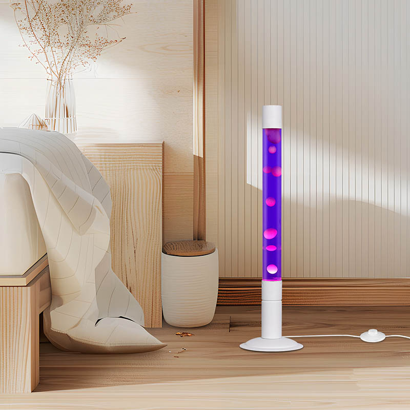 এই প্রদীপের সত্যিকারের হৃদয়টি তার কেন্দ্রীয় বৈশিষ্ট্যের মধ্যে রয়েছে: একটি দীর্ঘ, স্বচ্ছ কাচের নল যা বেগুনি তরল মন্ত্রমুগ্ধ করে ভরা। এই তরল, সন্ধ্যাবেলায় একটি প্রশান্ত লেগুনের স্মরণ করিয়ে দেয়, আলোর নীচে ঝলমলে, একটি শান্ত এবং মায়াময় পরিবেশ তৈরি করে। এই টিউবের অভ্যন্তরে, গোলাপী এবং বেগুনি বলগুলির একটি অ্যারে কৃপণভাবে ভাসমান, তাদের মৃদু গতিবিধি দর্শকদের মনমুগ্ধ করে এবং প্রদীপের স্থির আকারে একটি গতিশীল উপাদান যুক্ত করে।