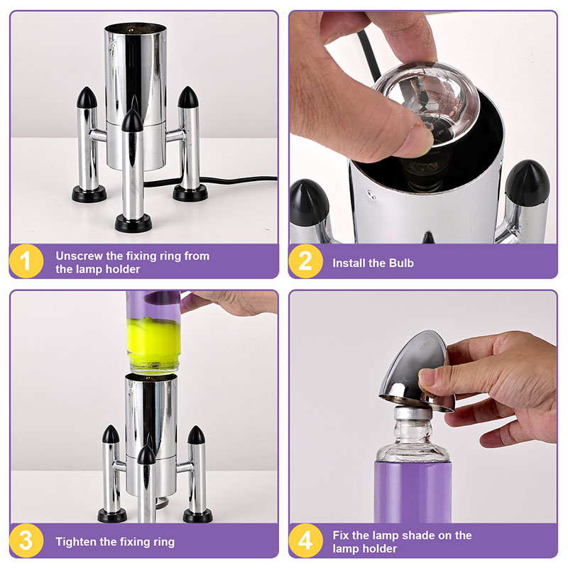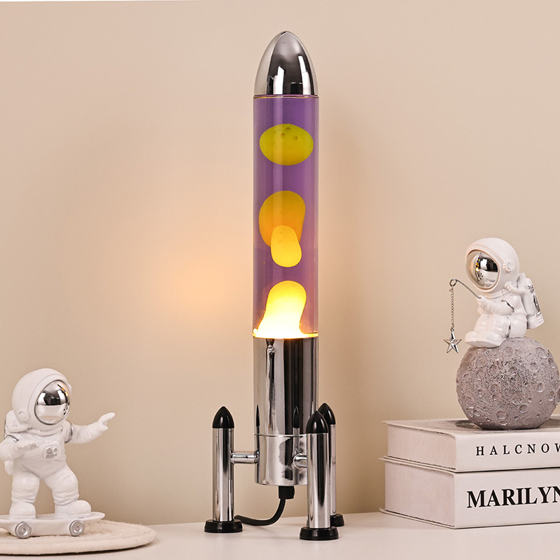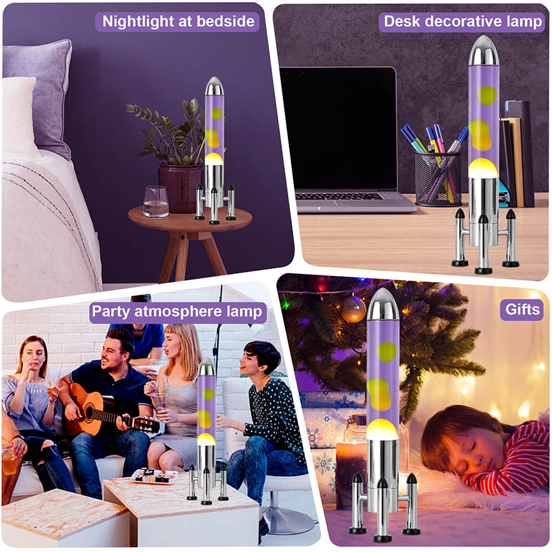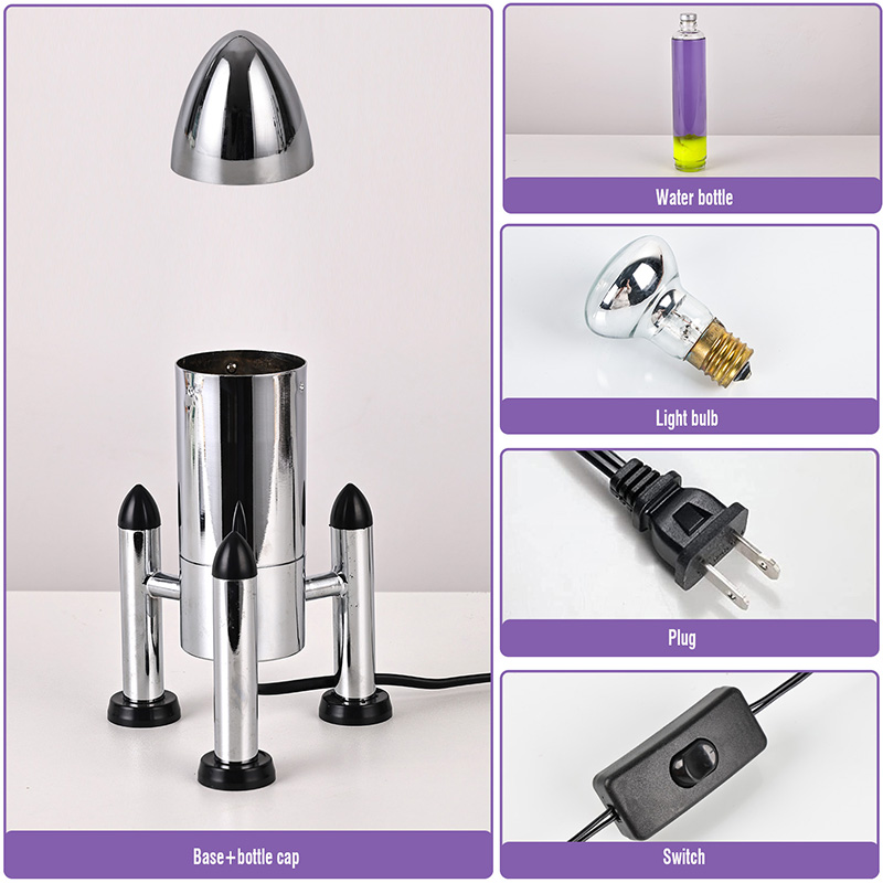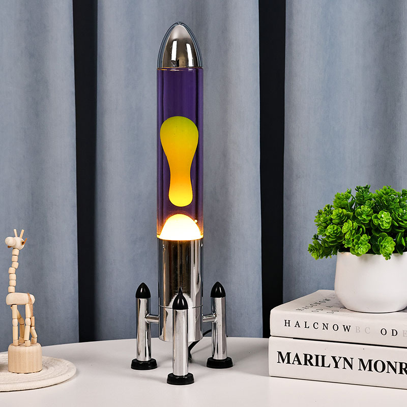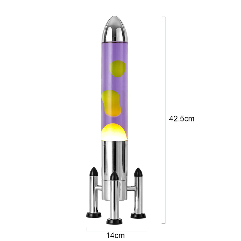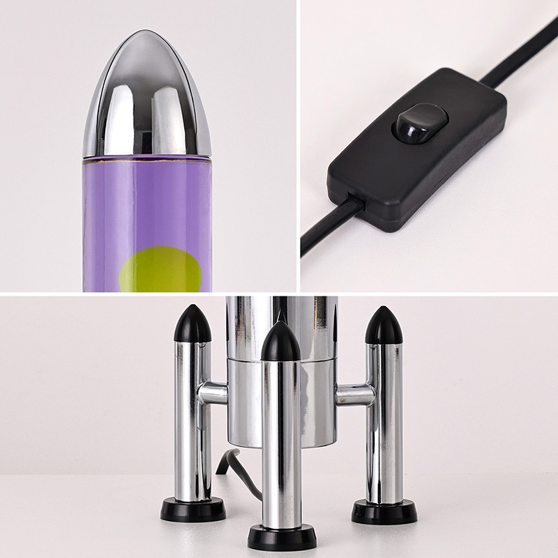 24Vরকেট শেড সহ বড় এলইডি লাভা বাতিতে একটি ক্লাসিক রকেট আকৃতির নকশা রয়েছে, একটি রূপালী ধাতব খোল রয়েছে যার সাথে একটি স্বচ্ছ কাচের বোতলের বডি যুক্ত, সহজ কিন্তু আড়ম্বরপূর্ণ। ভিতরে বেগুনি তরলে হলুদ ভাসে