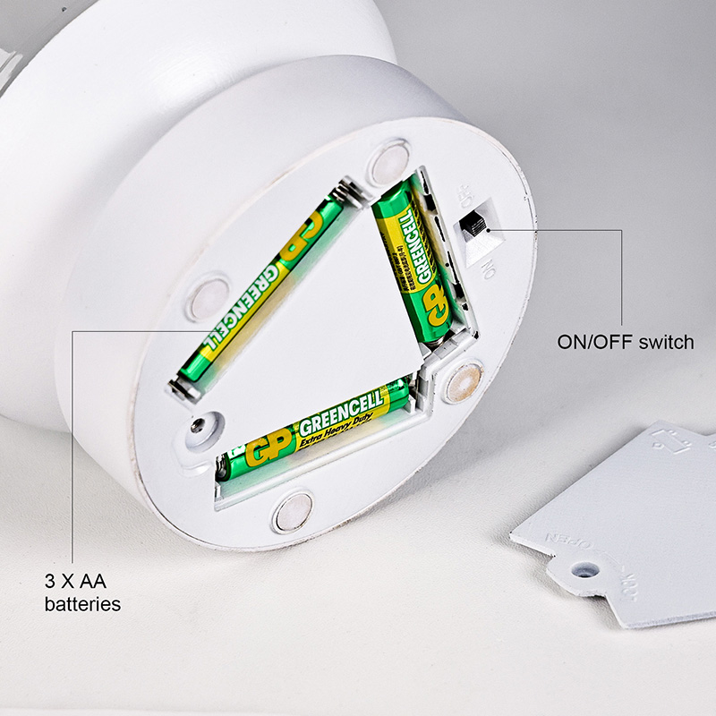 প্লাগ ইন করার জন্য কোন প্রয়োজন নেই; এটি শুধুমাত্র 3 AAA ব্যাটারি দ্বারা চালিত হতে পারে, সহজ ইনস্টলেশন এবং নমনীয় ব্যবহার সমন্বিত। নাইটস্ট্যান্ড, ডেস্ক, শিশুর খাঁচায় রাখা বা ক্যাম্পিং করা হোক না কেন
