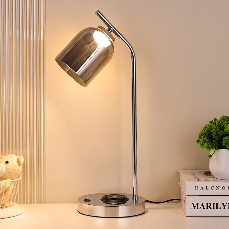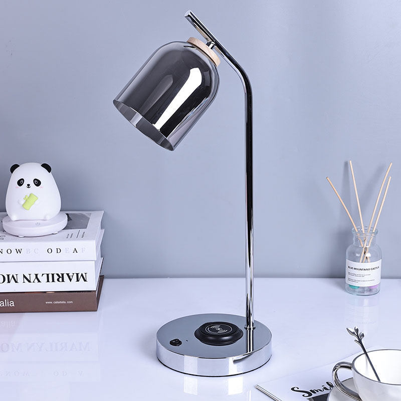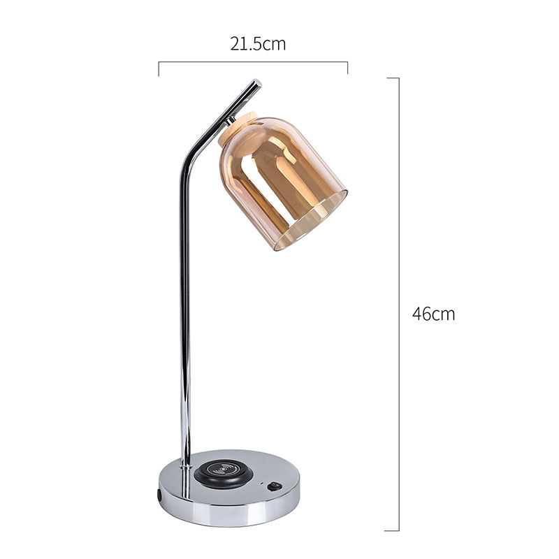 কাচের ছায়াযুক্ত কিউআই নেতৃত্বাধীন ডেস্ক ল্যাম্পে কিউআই বেতার শংসাপত্র রয়েছে। বেস সম্মুখের 5V1A বেতার ফোন চার্জার