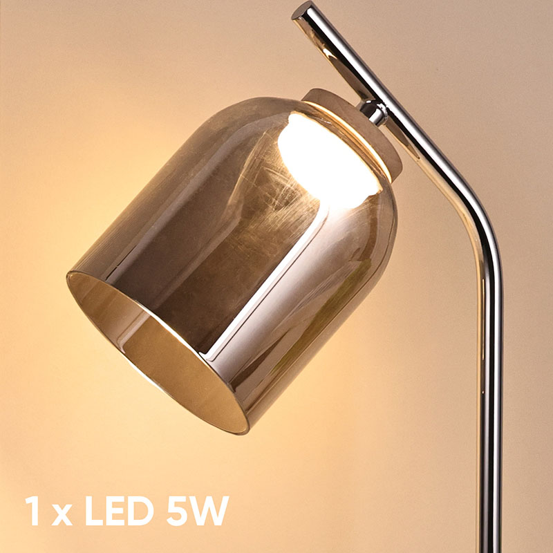 ক্রোম বেস, স্মোকি (অ্যাম্বার) গ্লাস শেডউদ্ভাবনী নকশা, কাচের উপাদান, উচ্চ-শেষ এবং মার্জিত চেহারা, অত্যন্ত শোভাময় ডেস্ক ল্যাম্প ডিজাইন শৈলী