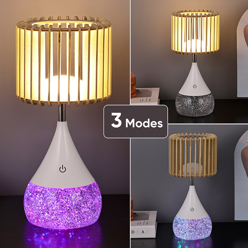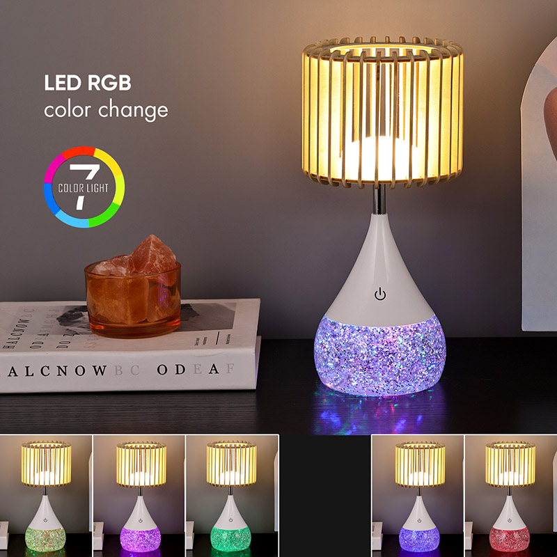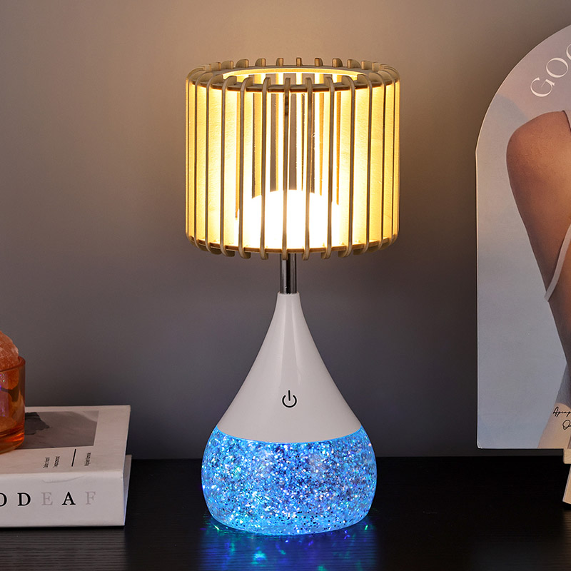 ডিজাইন:** অনন্য কাঠের স্ল্যাট ল্যাম্পশেড, আরজিবি রঙ পরিবর্তনকারী বেস