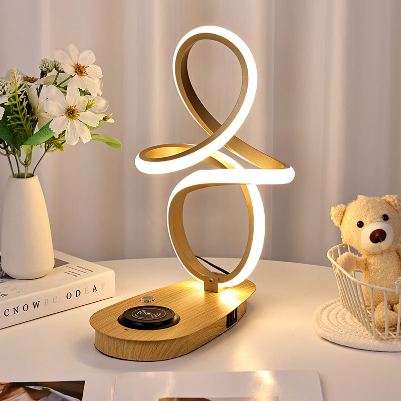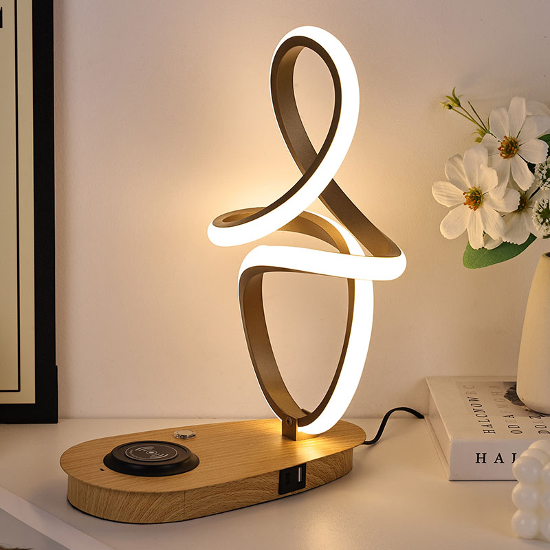 টেবিল ল্যাম্পের কাঠের বেসে, ওয়্যারলেস চার্জার LED ডেস্ক ল্যাম্পের সাথে ফ্রাইড ডফ টুইস্ট শেড হল LED উষ্ণ আলো।